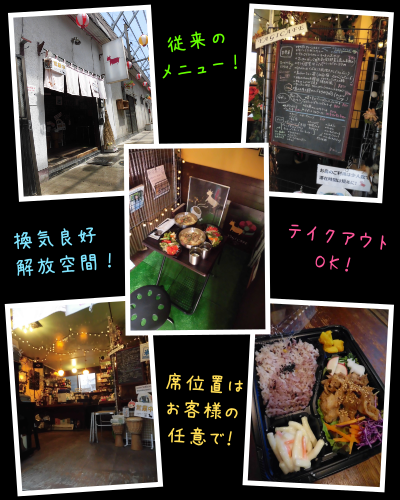 商品は掲示するお馴染みの黒板メニューからお選び頂き、外食娯楽を楽しめるような食器や盛り付けでお出しします。店頭注文でのテイクアウトにも対応し、こちらも従来のプラスチック容器にお詰めしてお渡しします。ただし、店内で飲食をする場合は、お客様自身で席位置を(安心・間隔確保を保てていると思う場所に)セッティングしていただきます。